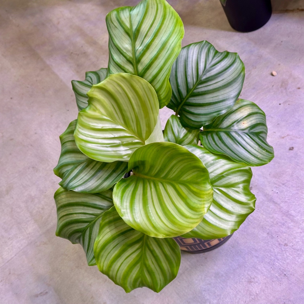 その中でもカラテア・オルビフォリアは、カラテアの中でも珍しい品種で、重なるように広がる丸葉は鮮やかな緑にシルバーの模様が入っており、カラテア特有の美しいフォルムが人気の1本です。