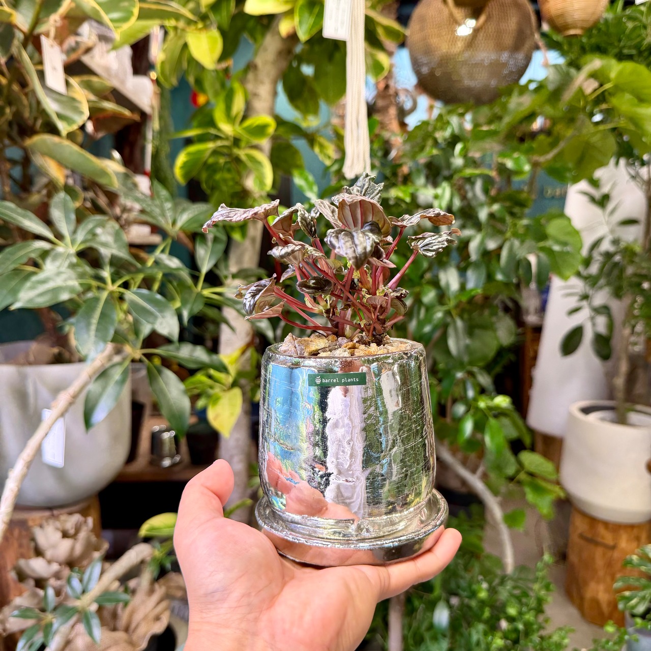 ペペロミア・レッドルナはコショウ科ペペロミア属の観葉植物です。その名の通り、深い赤紫(ワインレッド)の波打つ葉が特徴で、光の当たり方で艶やかに輝きます。名前の『Red Luna』は、ラテン語で『赤い月』。月のような艶と深い色合いの葉が由来とされています。神秘的な名前なのでギフトにもぴったりです。