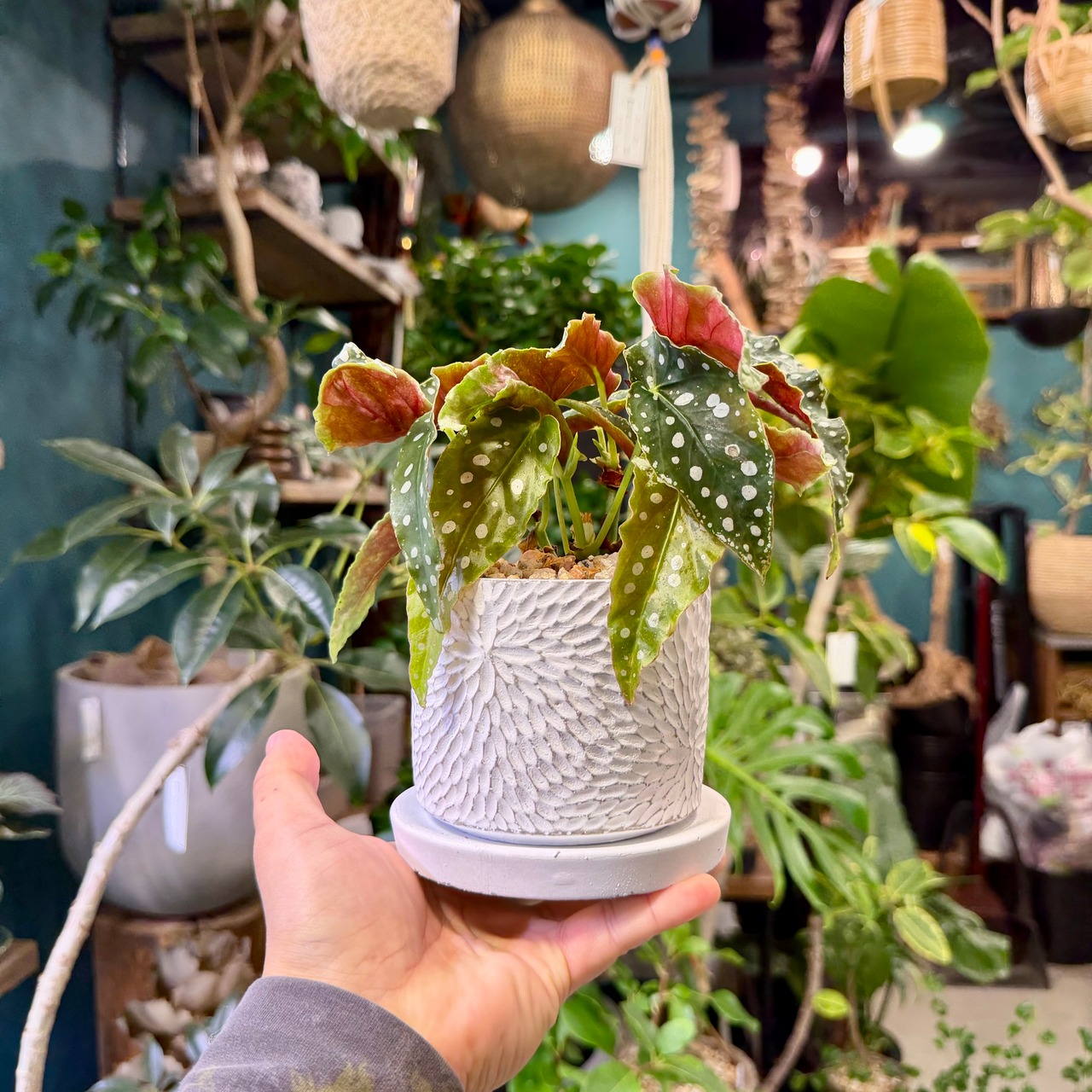 ベゴニアマクラータはシュウカイドウ科ベゴニア属で、葉模様が特徴の観葉植物です。英語では"Polka Dot Begonia(水玉模様のベゴニア"とも呼ばれます。葉の表面には銀白色の斑点があり、裏側は赤みがかったワインレッド、このコントラストが非常に美しくインテリアグリーンとして人気があります。