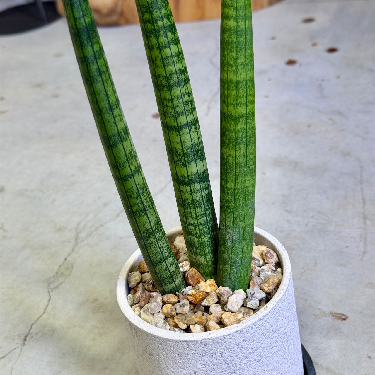 サンスベリア・スタッキーは円筒状の葉が上にまっすぐ伸びるという異形タイプです。葉が肉厚で硬く、ほぼ「棒」のように成長するので、シンプルかつモダンな印象が特徴的!成長すると高さが1mを超えることもあり、存在感のあるオブジェ的観葉植物として人気があります。