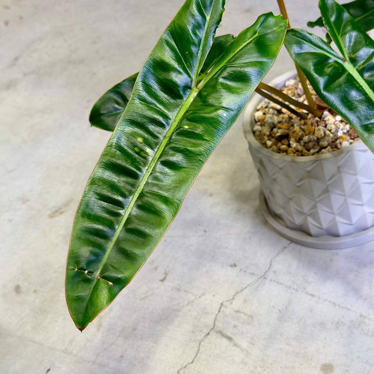 フィロデンドロン・ビレッティアはフィロデンドロン属の1種で、その長く伸びた葉と鮮やかな羽柄が特徴的なエキゾチックな観葉植物です。