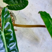 葉は細長いハート型をしており、大きく成長すると50㎝以上になることもあります。葉脈がはっきりしており、自然の造形美を堪能できます。オレンジ色、または黄色がかかった葉柄(ペティオール)はビレッティアの大きな特徴です。