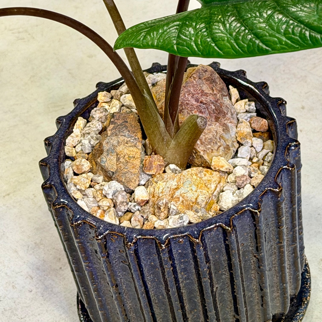 アロカシアらしく、湿度がある環境で葉が生き生きします。乾燥にはやや弱い面があります。成長はゆっくりですが、環境が合うと新葉がよく上がります。コンパクトな状態をキープしながら少しずつ育つため、室内でも扱いやすい植物です。