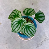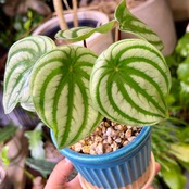 スイカペペに似ていますが、スイカペペは『ペペロミア・アルギレイア』丸くて幅の広い葉でスイカ模様が特徴ですが、サンデルシーは少し縦細長めのはで同じく銀模様ですが少し控えめの印象です。