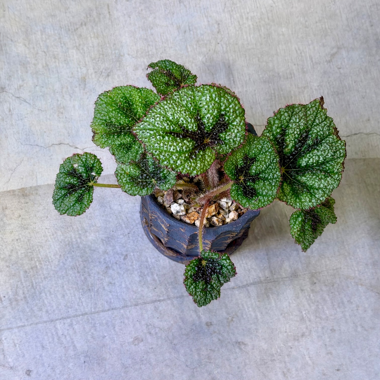 葉は少し縮れたような質感で、表面に細かな毛があり、ベルベットのような手触り。光の当たり方で葉脈や模様のコントラストが変化し、観葉植物として非常にインパクトがあります。