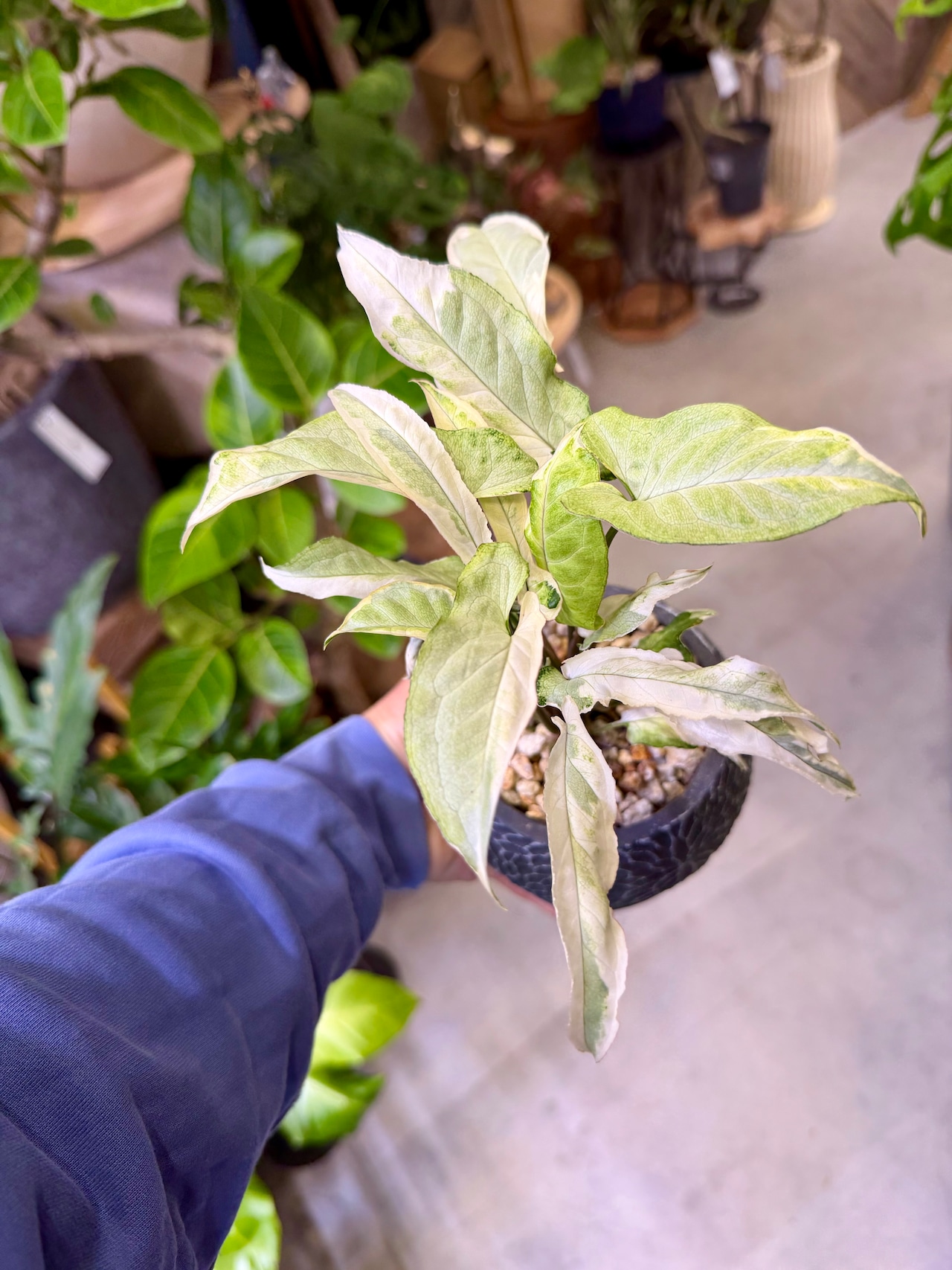 つる性なので支柱を与えると葉が大きくなり、より熱帯感が強くなります。吊り仕立てでもカッコよく、どの飾り方でも映える万能タイプです。