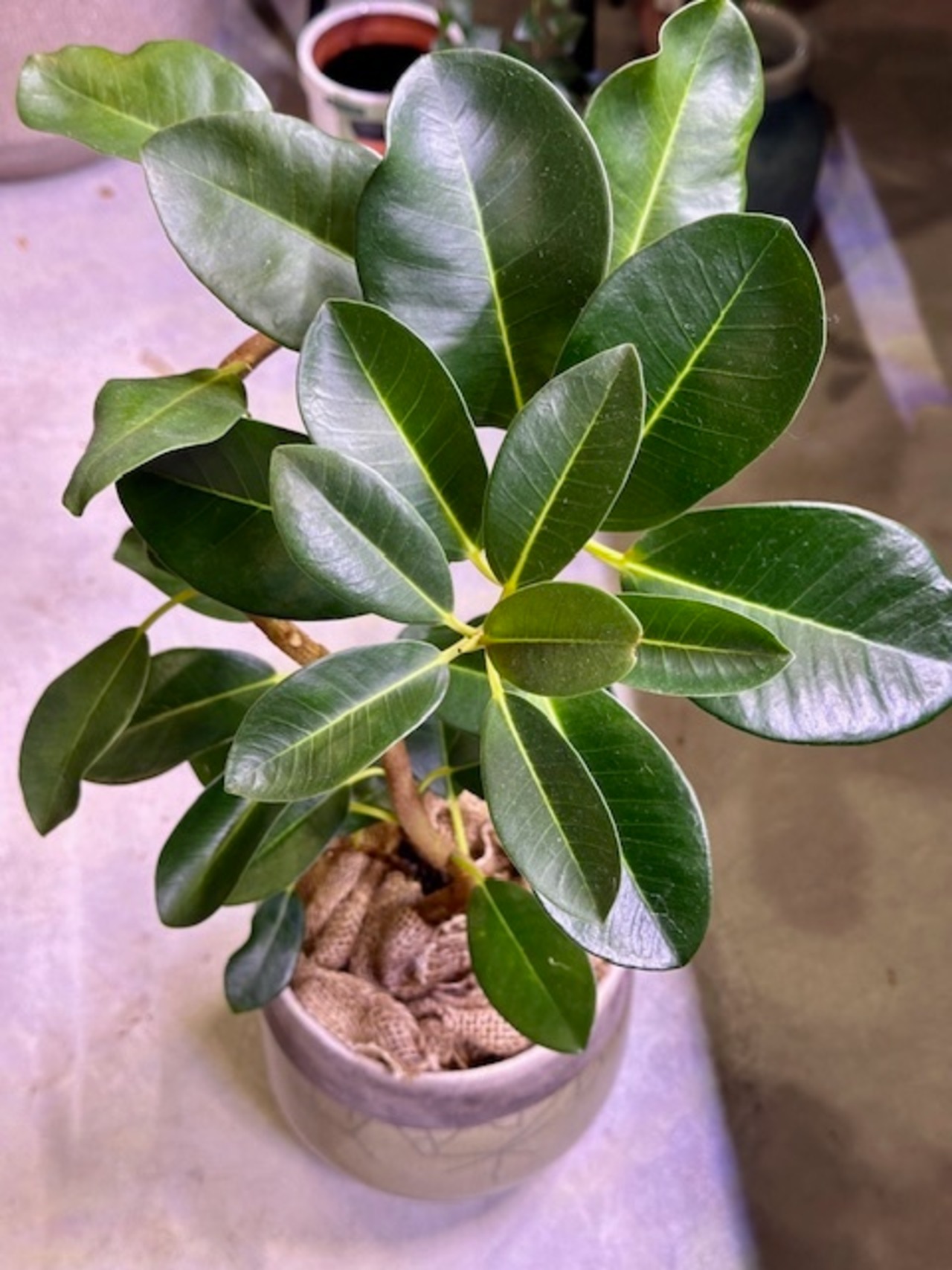 枝の曲がりが面白く美しい、フィカス・ルビギノーサ。よくフランスゴムと呼ばれており、ゴムの木の中では小さい葉と深い緑色が美しい品種です。