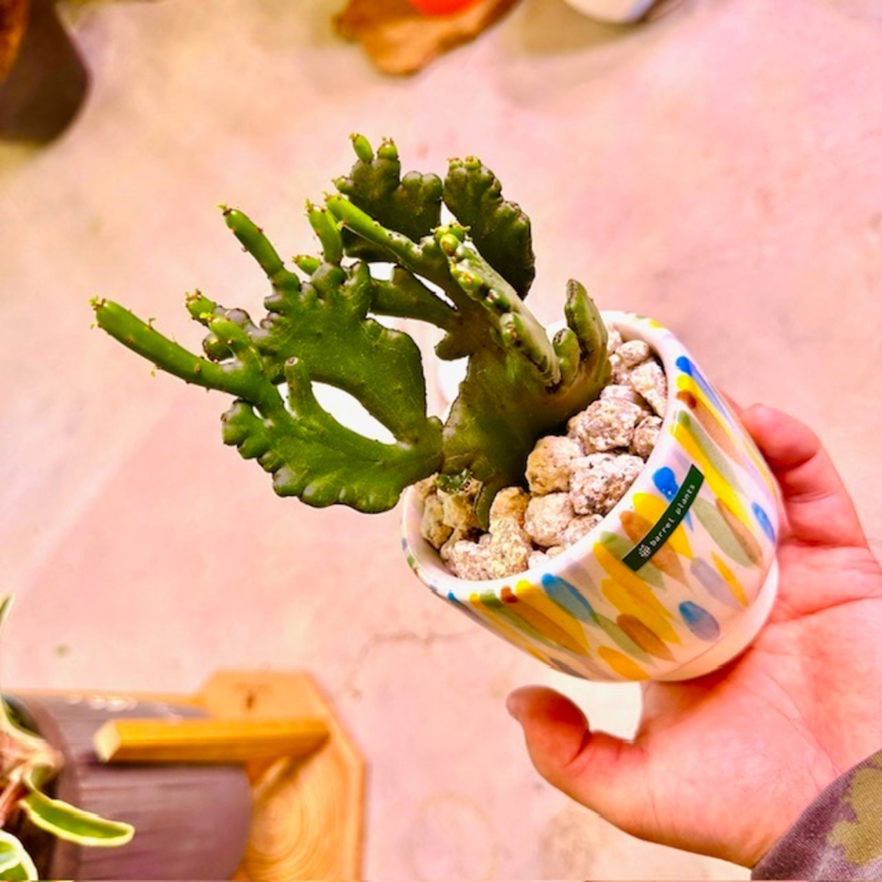 そんなオンコクラータの綴化(てっか)タイプです。綴化(てっか)とは本来「点」である生長点が帯状に変化し、茎が棒状ではなく幅広の帯状になる現象のこと。綴化品種は本来の姿とは違う「奇形種」ですが、そこに独特の表情があり、バーレルプランツでも人気の植物です。