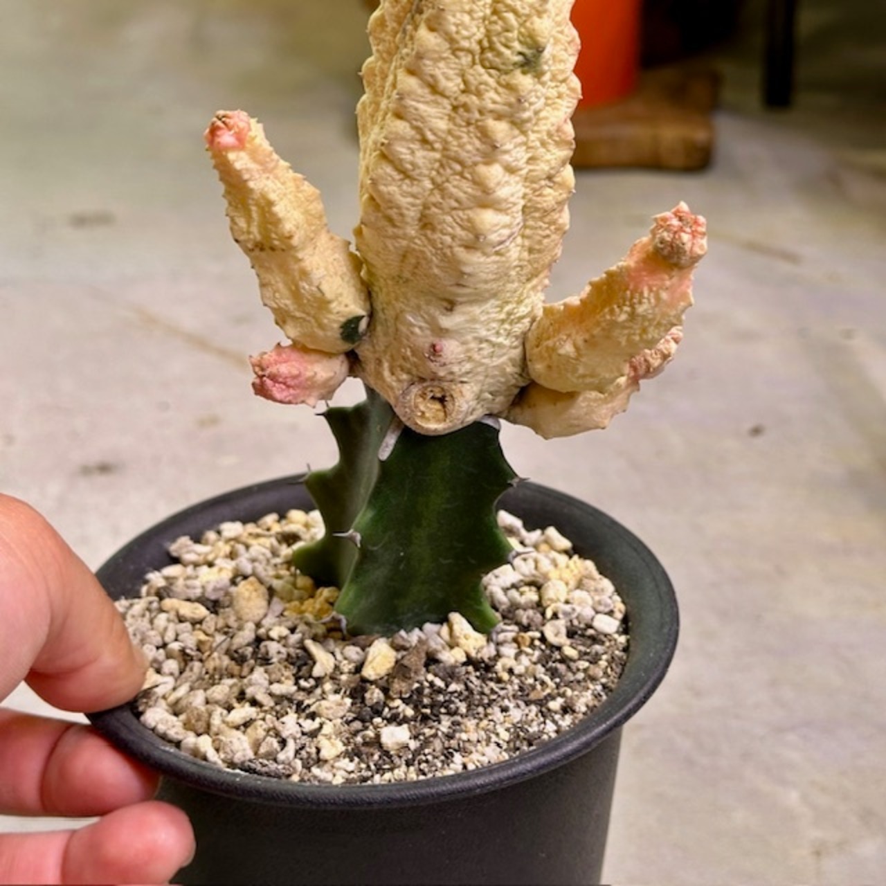 なので、単発での光合成ができないので、このようにユーフォルビアの接ぎ木で目にすることが多い品種です。葉緑素がないので接ぎ降ろしはできず台木がないと生きれない儚さはありますが、魅力しかない植物の一つです。